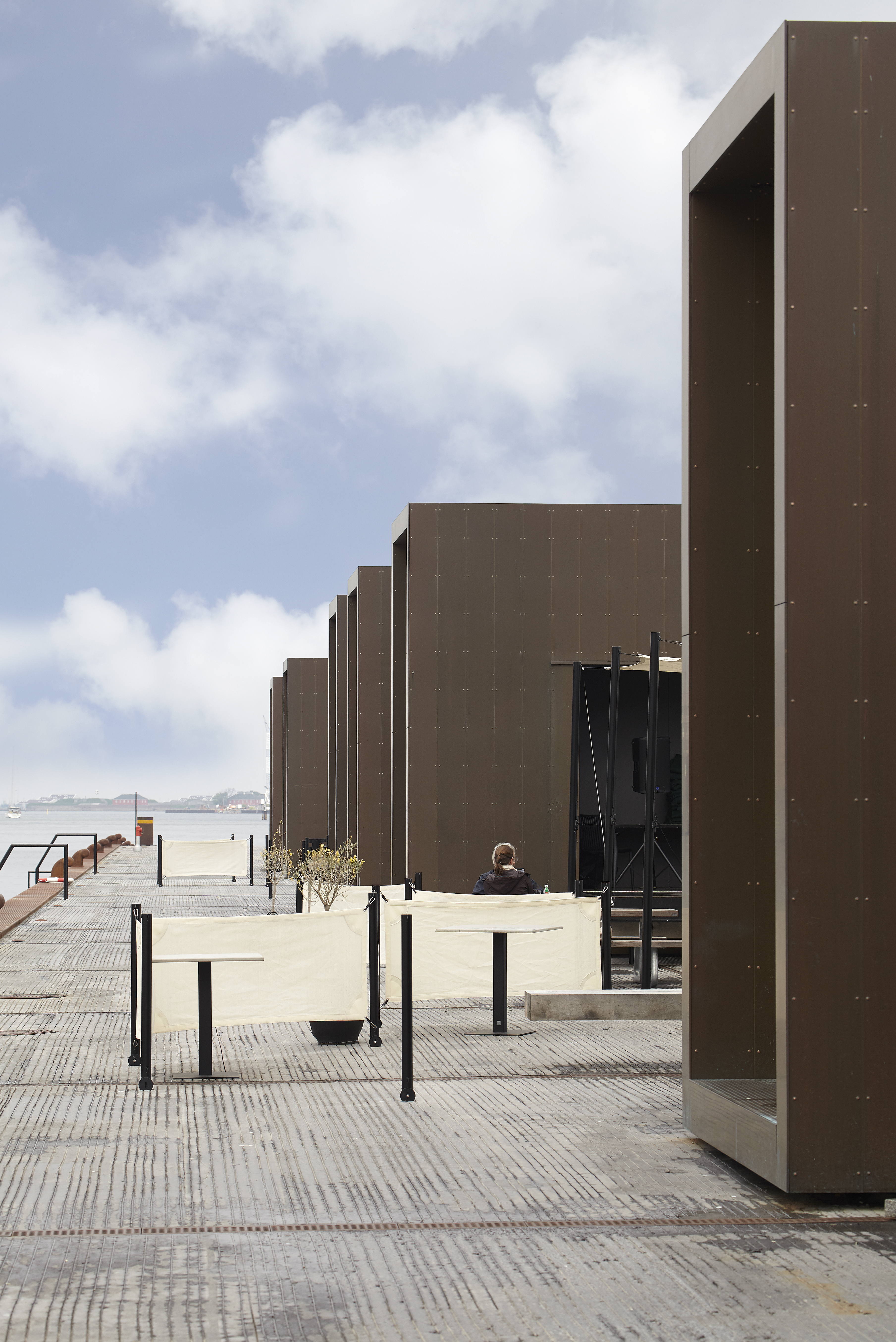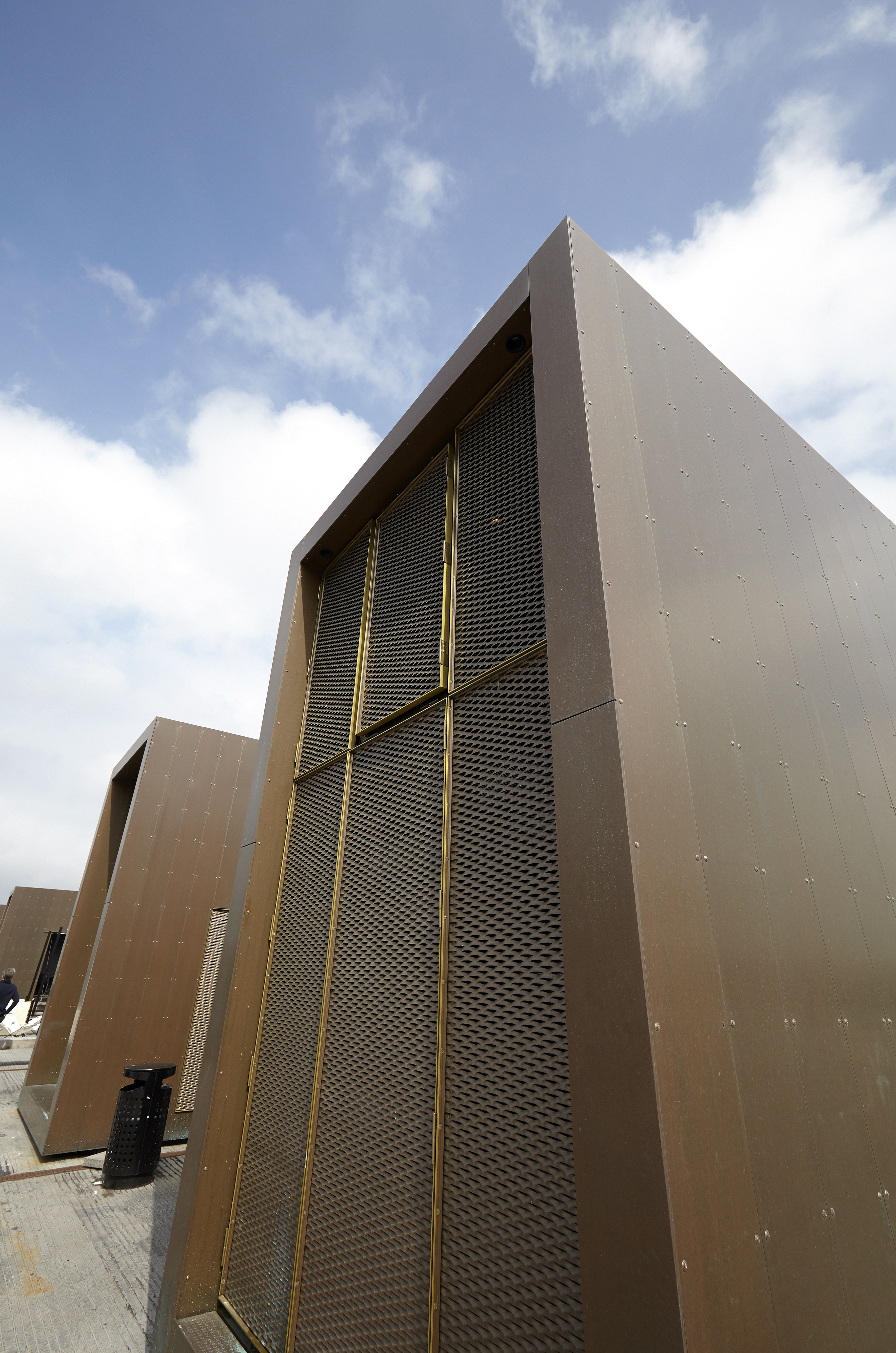 Pavilony mají obklad z materiálu Tombak CuZn15, což je materiál vyvinutý společností KME a dodávaný společností Metalcenter Group. Design fasády pavilónů je velmi neobvyklý – jakoby autor chtěl, aby byly silné pláty z přední strany staveb vidět.