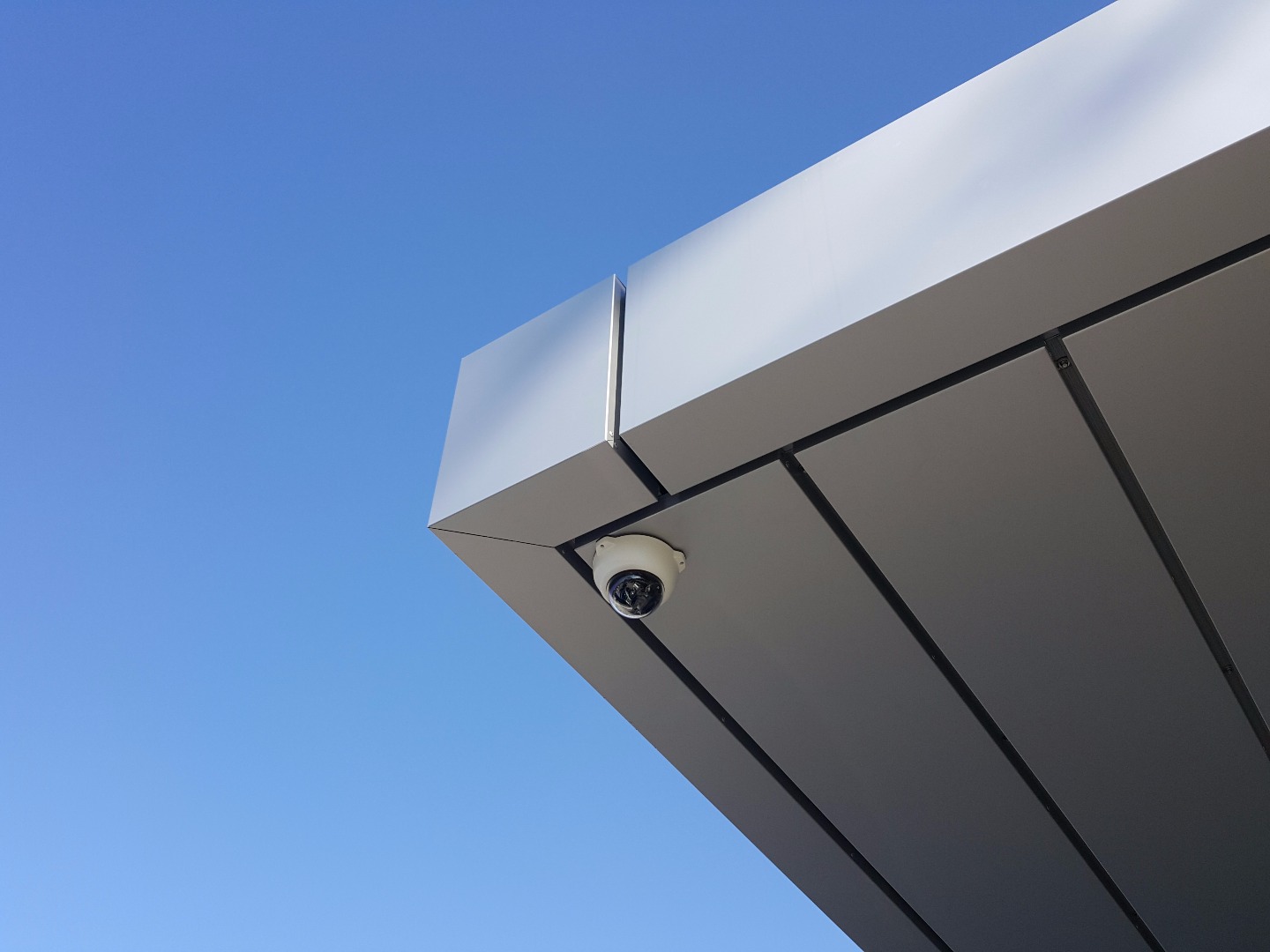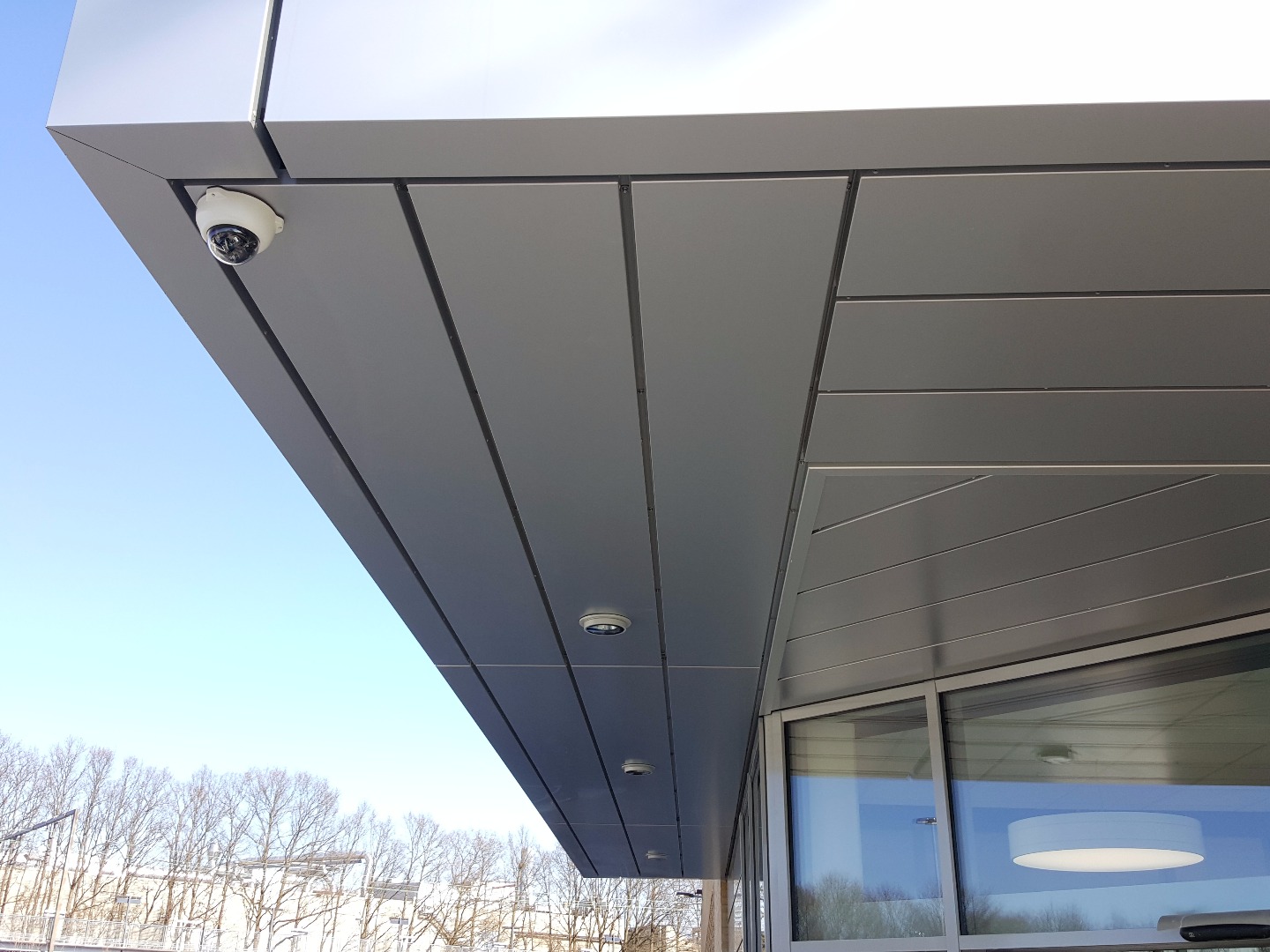 Venkovní obložení kazetami Alucobond na stěnách a stropu vchodu do obchodu a kolem oken v barvě Silvermetallic 500.