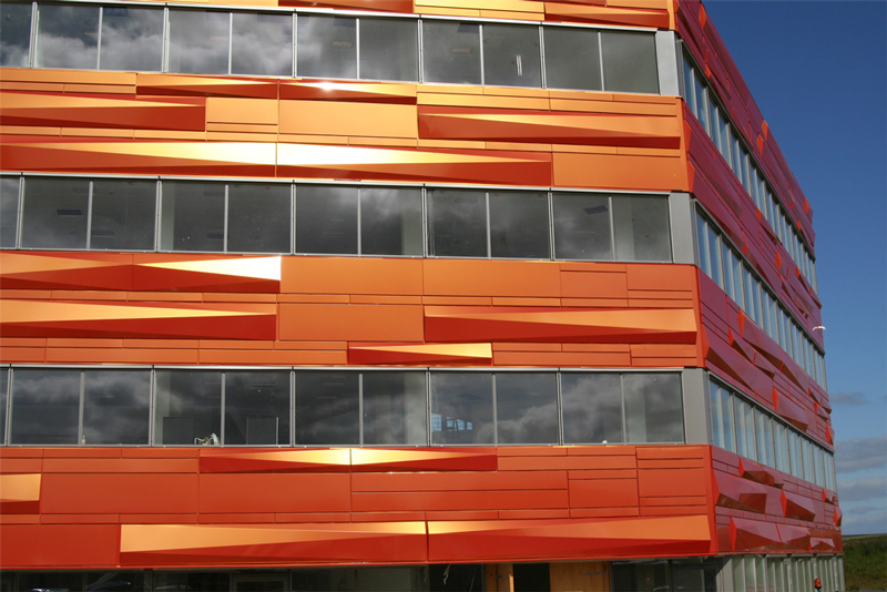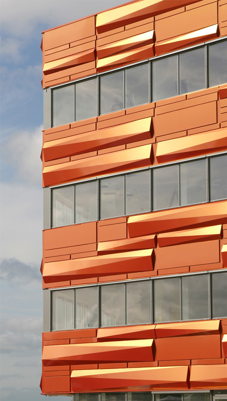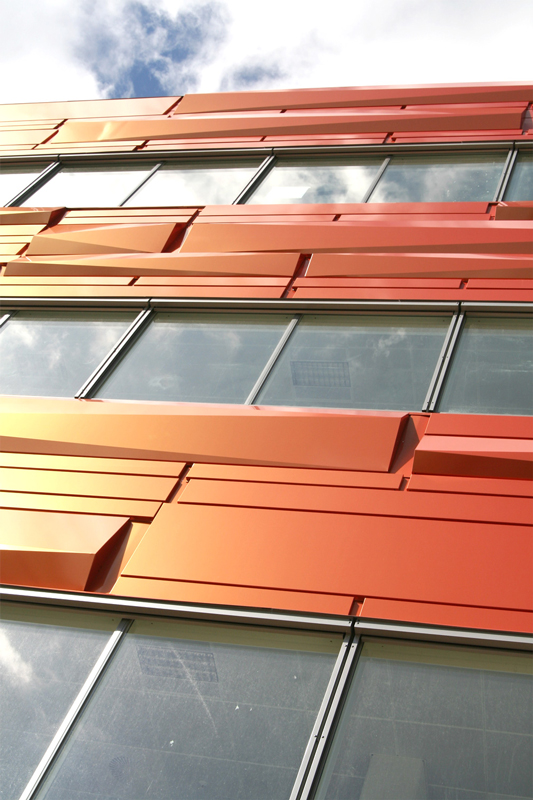 Fasáda je obložena sendvičovými deskami Alucobond v barvách spektra, které mění barvu podle úhlu, z něhož se díváte.