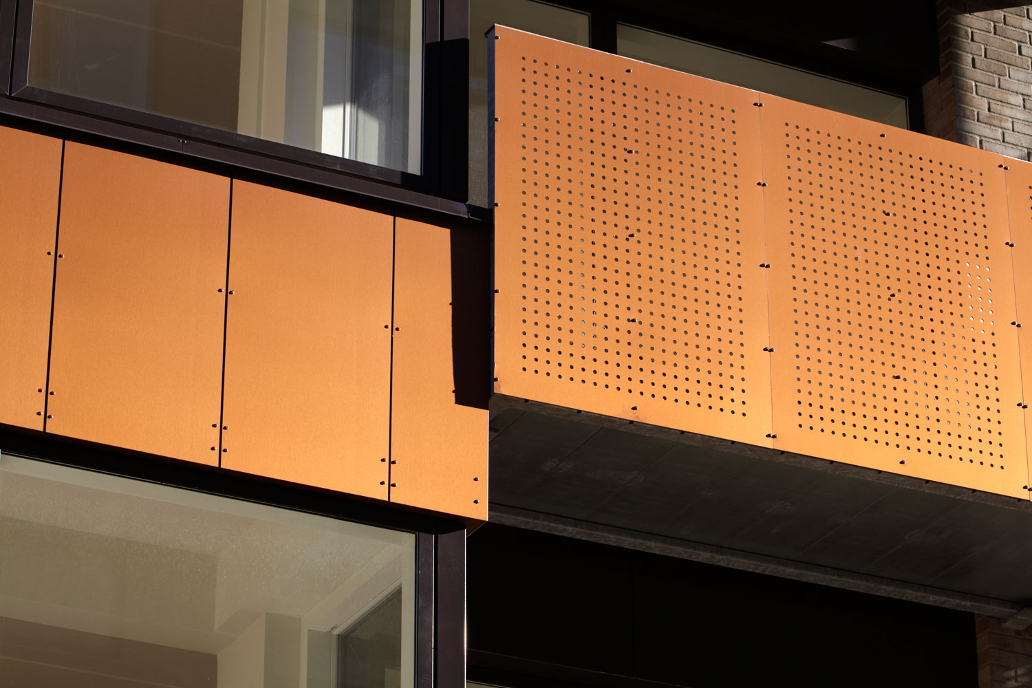 Venkovní obložení fasád a balkonů panely Alucobond Plus naturAL COPPER 412. Na balkonech jsou namontované desky perforované otvory o průměru 15 mm pravoúhle uspořádané ve vzdálenosti 45 mm. Podpěry jsou namontovány na hliníkové armatury a profily.
